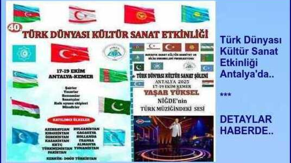 13 ülkenin katılımıyla gerçekleşecek olan “Türk Dünyası Kültür Sanat Şöleni”, 17-19 Ekim 2025 tarihleri arasında Antalya'nın Kemer ilçesinde düzenleniyor.