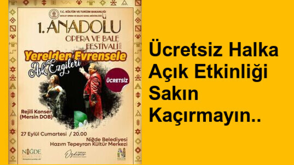 T.C. Kültür ve Turizm Bakanlığı Devlet Opera ve Balesi Genel Müdürlüğü sanatçı grubu tarafından Niğde'de yılın önemli bir etkinliği gerçekleştirilecek..